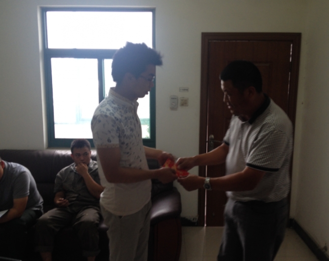 4.6月25日,在辦公樓二樓陳總辦公室,陳總和馬總對在平日里辛勤工作的公司車隊修理工們進行了表彰,其中,修理工劉洋師傅在車隊駕駛員滿意度調(diào)查中,獲得的滿意度最高。為樹立典型,發(fā)揮先進員工的帶頭作用,公司對劉洋師傅進行了獎勵,借此表示對所有奮斗在一線,拼搏在一線的員工的贊揚,感謝他們?yōu)榱斯景l(fā)展所做出的突出貢獻。